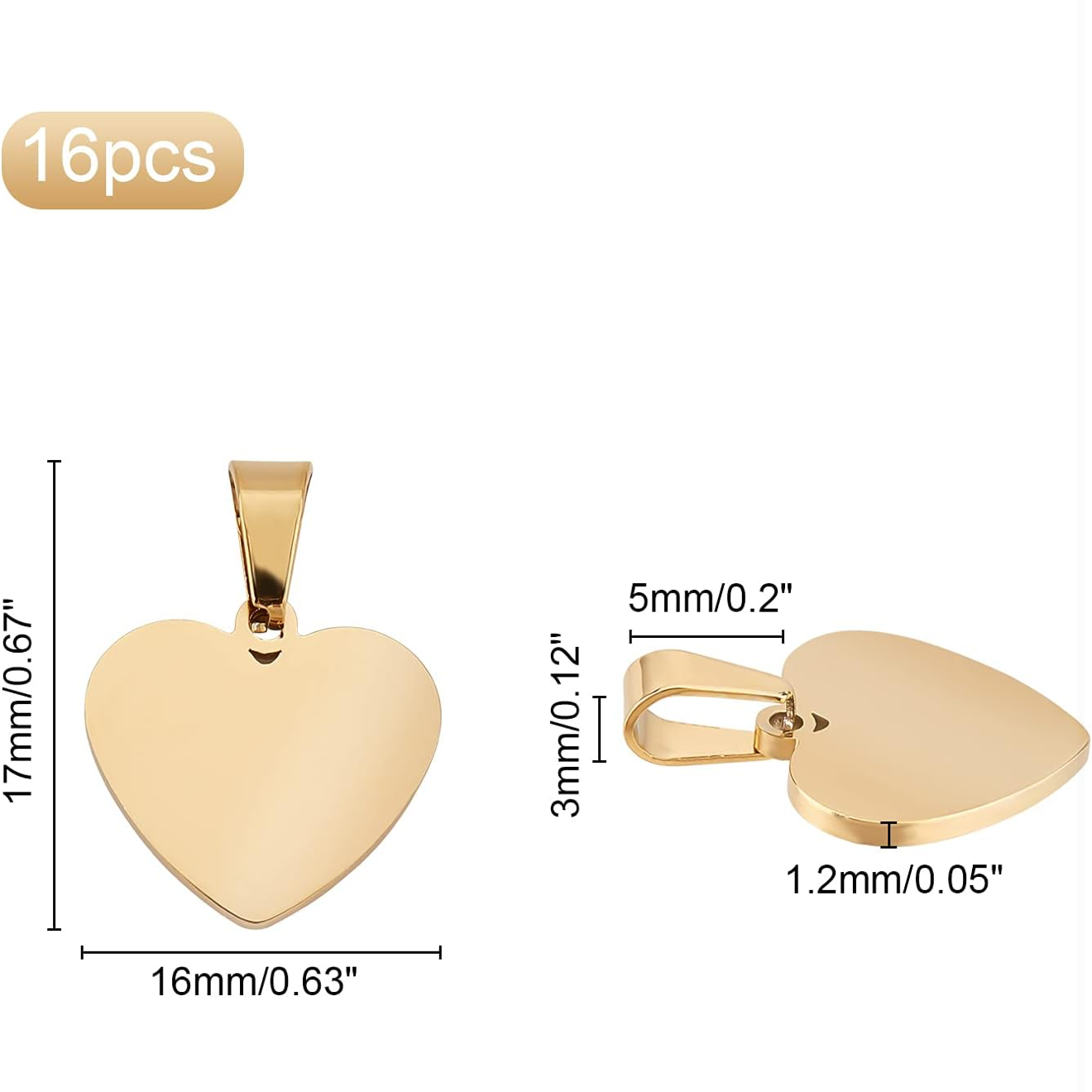 Größenerwähnung: Der Herzanhänger in goldener Farbe, ca. 16 mm lang, 17 mm breit, 1.2 mm dick, Bohrung: 5x3 mm,